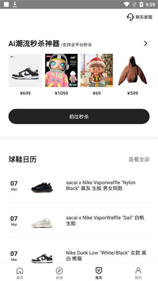 4、在“服务”这个页面,可以很方便地找到正在进行的秒杀产品。当然,要是遇到什么问题,直接点右上角的客服按钮就能联系到他们,很方便。
