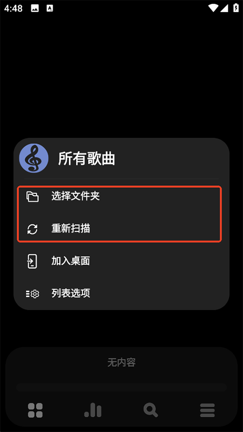 4、这时候会跳出选项,你可以让它自动扫描整个手机,也可以自己手动指定包含音乐的文件夹。