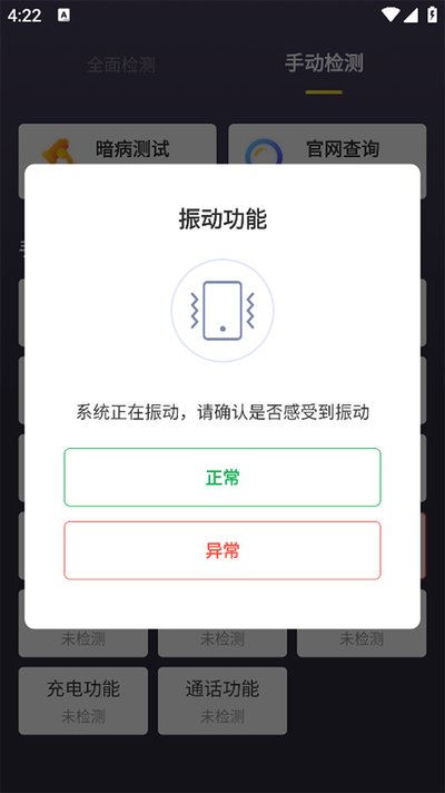 4、举个例子,测试振动功能时,手机会嗡嗡响。如果你感觉到了振动,就选“正常”。