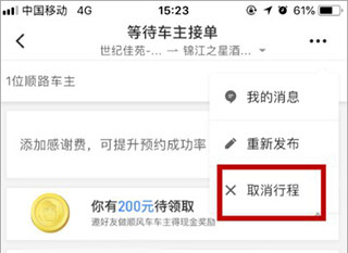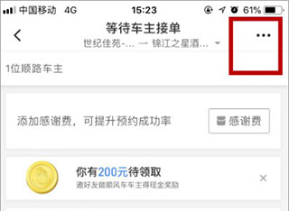 2、进入行程详情页,你就能看到有哪些顺路的司机。要是没看到合适的,可以取消或者重新发一次。我们直接点右上角那三个点的图标按钮。