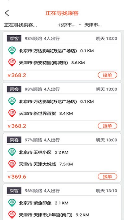 3、在快滴顺风车里,车主能看到实时的订单,咱们乘客也能随时发布出行计划,不管是出去玩、出差还是过节回家,只要是顺路都能解决。