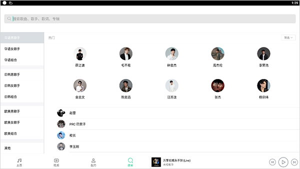 3、或者去搜索页面,在顶上的搜索框里输入你想找的歌,或者按歌手分类来找歌听。