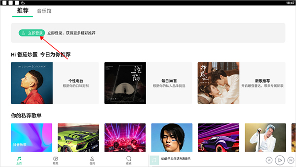 1、打开App登录之后,主页上就有每天给你推荐的歌曲,直接点开就能听。