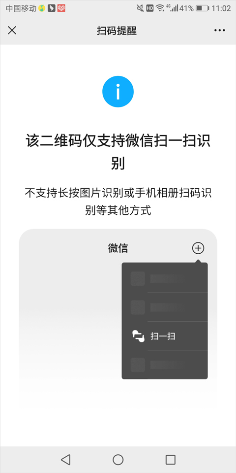 但如果你就只有一台手机,那就比较麻烦了。平板版App里的微信模块本身没有扫码功能,所以你没法用它去扫别的码。就算你把二维码截图保存下来,再打开微信用“扫一扫”里的相册功能来扫,也是行不通的。因为这种登录二维码不支持反向扫码。我自己试过了,最后就是下面这个页面。