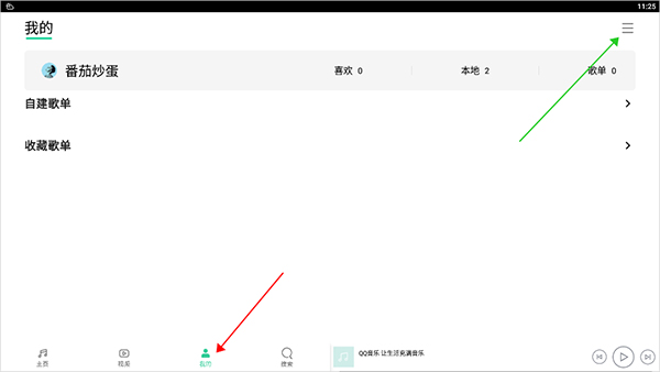 1、打开App后,先点一下页面底部导航栏里的“我的”(下图红色箭头指的区域),进入个人主页。然后,再点击右上角那个长得像三条横线的图标(下图绿色箭头指的区域)。
