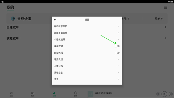 2、在弹出来的设置选项里,找到“桌面歌词”这一项,点击它右边的开关按钮把它打开。