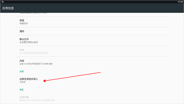 4、接着会跳转到系统的设置页面,你往下滑,找到“高级”这个部分,然后点击“出现在其他应用上”(下图红色箭头指的区域)。