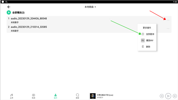 2、点进去之后,App会自动扫描并把你设备里的本地歌曲都导进来,显示在页面上。你可以随便选一首,点击它右边那个像三个小圆点的图标(下图红色箭头指的地方),在弹出的下拉菜单里选择“加到歌单”(下图绿色箭头指的地方),把它加到你的歌单里,或者直接点击播放也行。