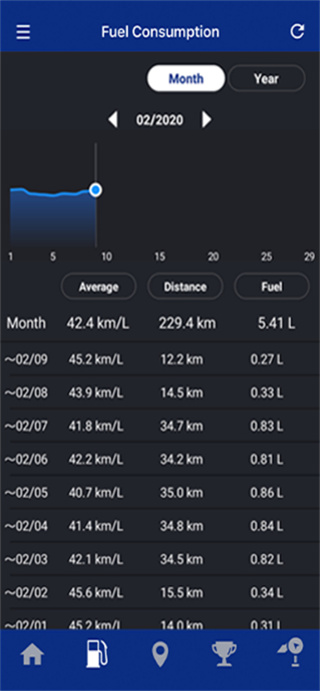 2、油耗记录能够让其按天、按月以及按年进行查看,以了解自己在最近骑行中的油耗量也能够及时调整用车程度;