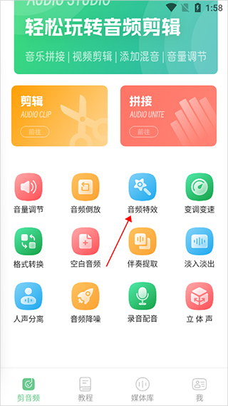 1、想给音频加点料的话,回到App首页,看到那个【音频特效】的选项了没?对,就是它,点进去。