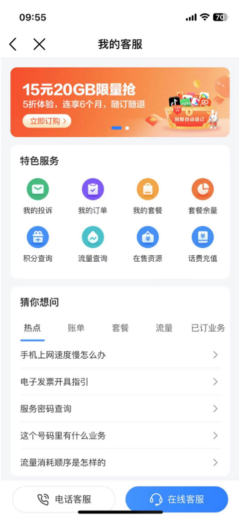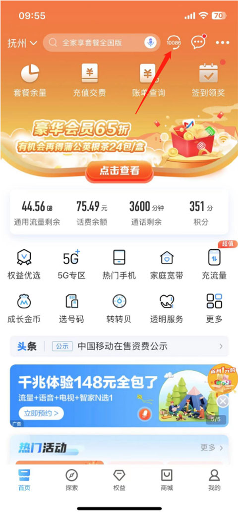 1、打开App,看到主页右上角那个耳机样式的10086小图标了没?对,就是它,点进去。