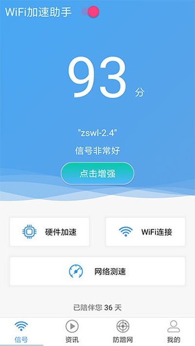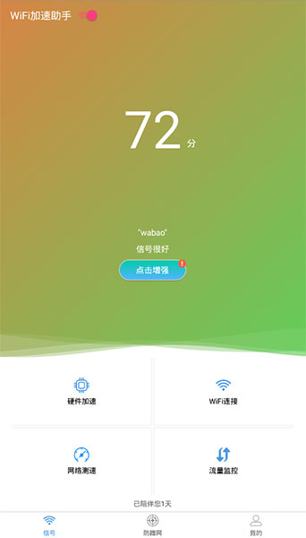 1、装好打开就是主界面,功能分区很直接,硬件加速、连WiFi、测速、看流量这四个大块,上手没啥难度。给你们看下截图就明白了。