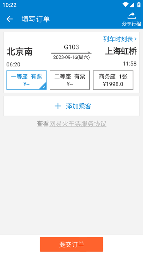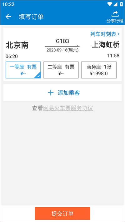 3、最后一步,先把坐车的人信息加上,然后选好座位,检查一下没问题就可以点“提交订单”去付款了。