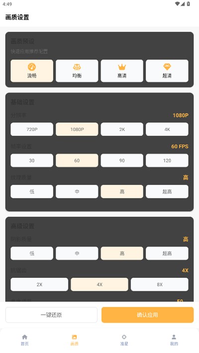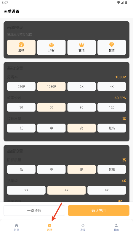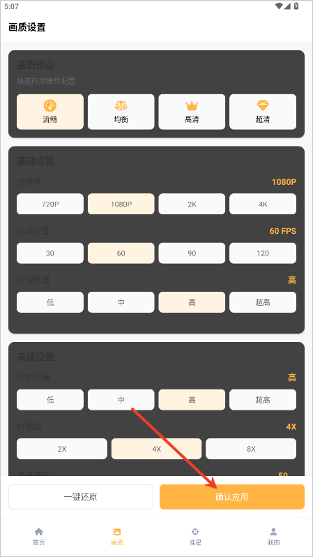 3、进去之后把各种画质参数按照你的手机性能和喜好设置好,最后别忘了点“确认应用”保存。