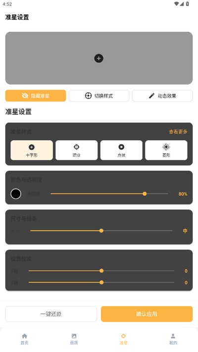 4、回到主页再进“准星栏”,同样是把参数调教到自己舒服的状态,点一下应用就完事了。