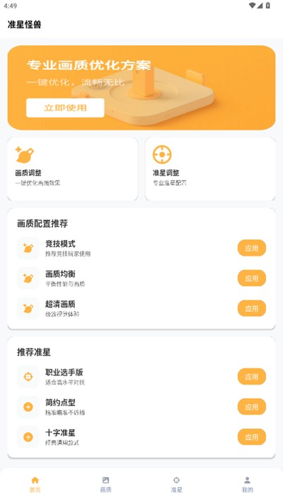 1、刚打开准星怪兽,主界面就两大块,一个是“准星调整”,另一个是“画质调整”,一清二楚。