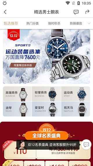 男士腕表类别下,进一步细分出高端商务、轻奢商务和运动表等子分类,旨在帮助用户更迅速地找到目标商品。。