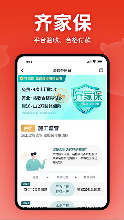 它有个叫“齐家钱包”的东西,相当于装修界的支付宝,你验收满意了再放款给施工队,钱在平台手里,主动权就在你这儿,心里踏实多了。万一有啥问题,还有先行赔付、无忧退订这些保障,投诉响应也快。