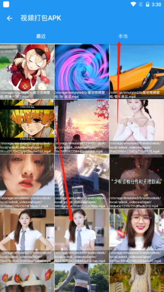 4、接着就会让你从手机相册里选视频。你可以直接在列表里找,也可以点击上方的“本地”,去手机存储的具体路径下找那个视频文件。