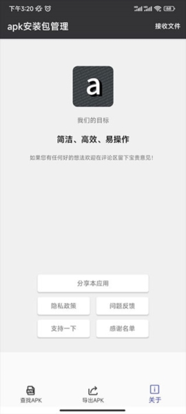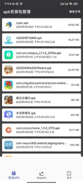 1、启动应用后,可以看到其主界面底部仅设有“查找apk”、“导出apk”和“关于”这三项功能。。想找手机里没装的安装包,点第一个就行。