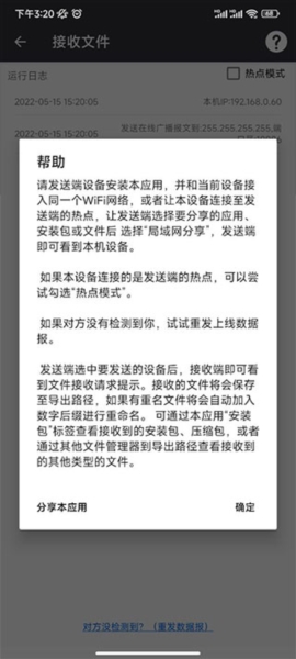 4、看到截图里这个界面没,它还支持用热点来分享和接收文件。