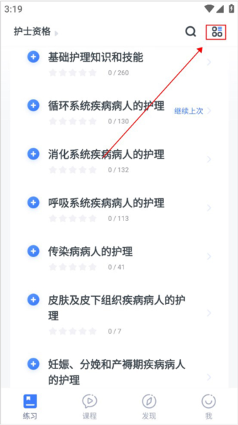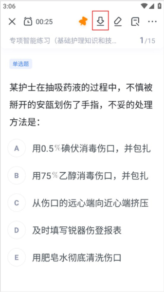 2、大家看下面这张截图,整个界面是白色的,还挺符合我们“白衣天使”的身份。在“练习”版块里,挑一个你想练的题库点进去,看到练习界面顶部那个“下载”的小图标没,点它。
