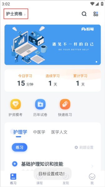 1、进来之后先选好你的考试目标,在主页左上角那个位置,可以选你要考的专业方向,这样题库就会自动切换,很方便。