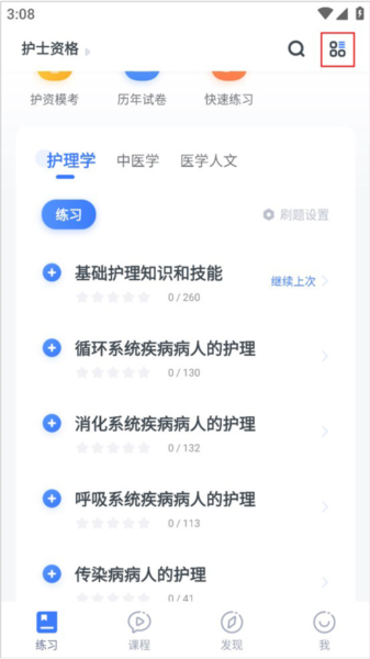 1、想找错题本也简单,还是先回到“练习”主页面,然后点你想看的那个题库右上角的菜单按钮。