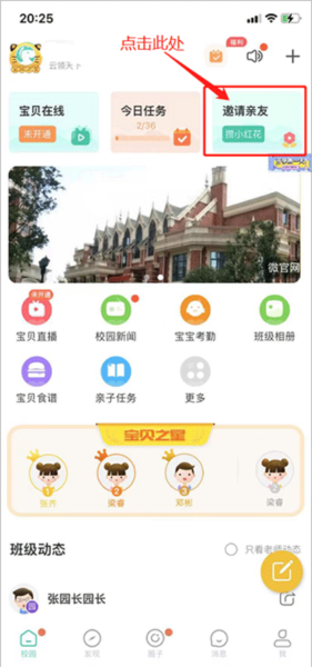 1、打开App,在主页“校园”这个界面里,找到并点一下“邀请亲友”。大家可以看下面这张截图里的位置。