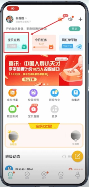 1、第一步,打开App之后,先确认底下选中的是“校园”这个板块,然后点左上角的“宝贝在线”,看到截图里这个界面没。