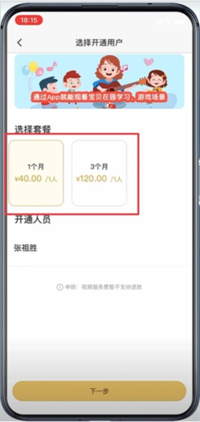 3、到这一步就是要选择套餐了。讲真,这个功能要收费我能理解,但套餐选择稍微有点少,不过为了看娃也值了。你根据自己的需要选一个,然后点下一步。