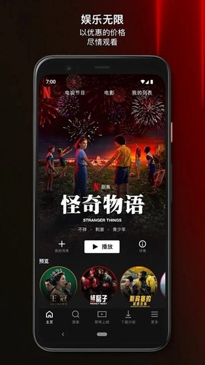 好几年的追剧神器——奈飞(Netflix)!老玩家应该都知道,这玩意儿就是高质量美剧、电影的代名词。最近刚帮朋友在安卓手机上搞定,顺手写个保姆级分享。它家自制剧真的封神,什么《怪奇物语》、《后翼弃兵》,随便一部都停不下来。最爽的是,界面干净没广告,自带官方中文翻译,再也不用满世界找野生字幕了。刚上手的朋友看过来,主界面长这样,挺清爽的。
