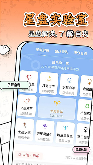 2、有个叫星盘实验室的功能,能帮你解读自己的星盘,让你更了解自己。