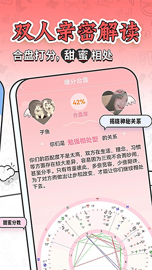 3.、情侣合盘功能,可以算算俩人合不合拍,给个分数,教你怎么处对象。