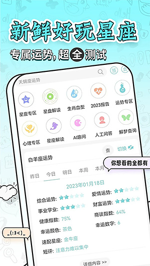 1、星座内容挺全的,运势分析和各种测试都比较新潮,不是那种老掉牙的玩意儿。