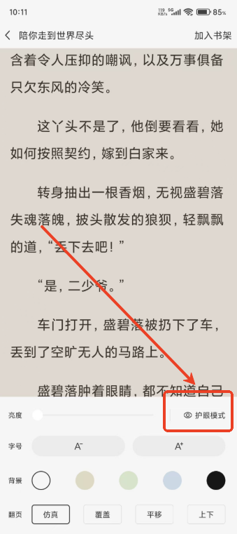 3、进入阅读界面之后,从字体大小到背景颜色,再到翻页的方式,全都可以按照你自己的习惯来调整,怎么舒服怎么来。
