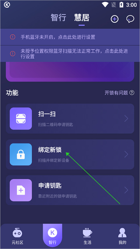 1、App装好登录进去,在【智行】主页找到【慧居】,进去之后按提示把手机蓝牙开了,然后点那个【绑定新锁】就行。界面长这样: