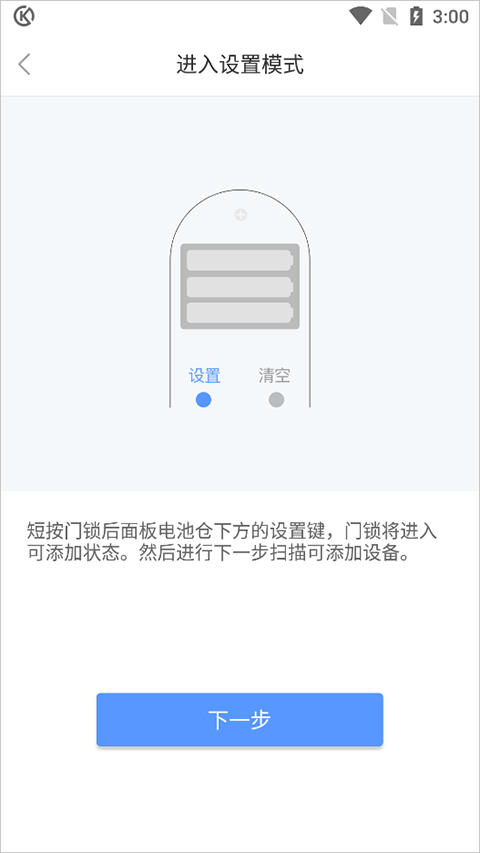 2、这时候App会让你去操作门锁。找到门锁内侧电池仓下面的那个设置键,短按一下,锁就进入配对模式了。然后手机上点下一步开始扫描。