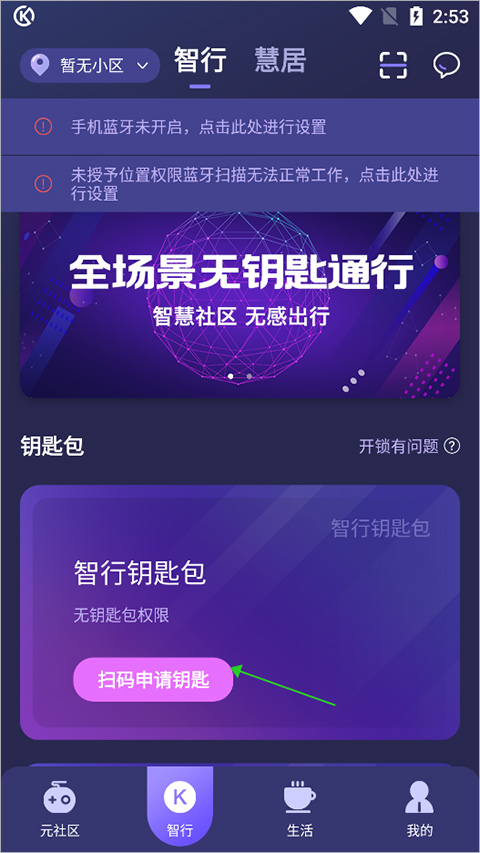 先进【智行】这个主界面,就能看到【扫码申请钥匙】的按钮。