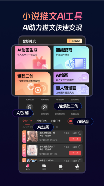 智影推文是一款集小说授权、AI视频生成、文案改写、智能配音等功能于一体的创作工具,专为小说推文赛道创作者设计,能帮助新手快速上手,高效产出原创推文视频,实现副业收益,是内容创作者的得力助手。
