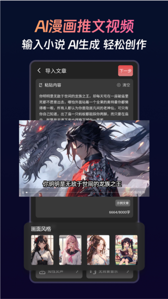 3、接着就把你的文案弄好,选个喜欢的风格,让AI帮你生成视频或图文作品。