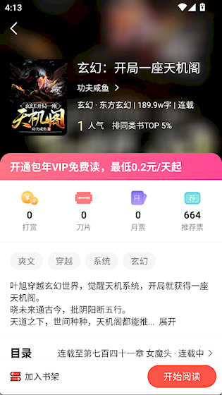 2、进到书的详情页,能看到简介和目录。想追的话就点“加入书架”,然后直接“开始阅读”开看。