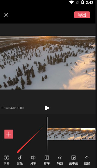 3、然后就进到编辑界面了,大家看下面这张截图,最底下那排就是各种功能,像加字幕、配音乐、分割视频都在这里操作。