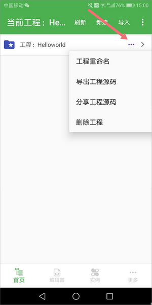 5、在项目文件夹右边有三个点,点开就是菜单。在这里可以给项目【工程重命名】,或者不想要了就直接【删除工程】。