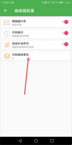 2、在新页面里,往下滑找到【代码缩进单位】,戳一下。