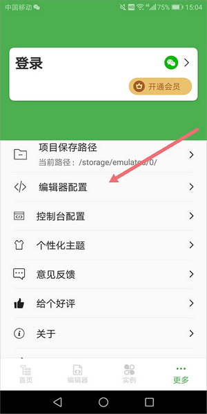 1、想调整代码缩进的话,先去“更多”页面,找到【编辑器配置】这个选项点进去。