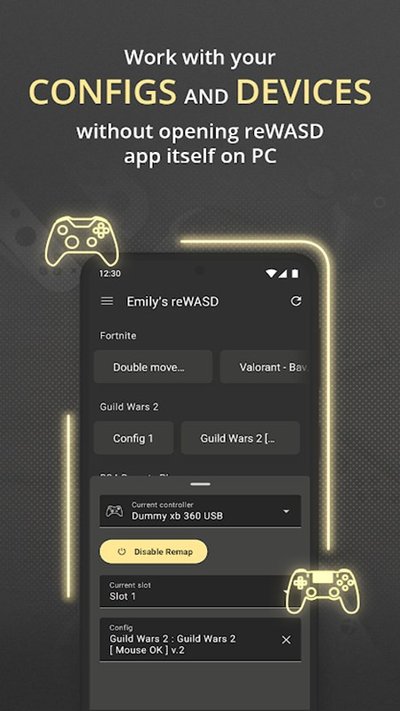 而且装了Junior之后,查配置、看映射、改设置这些事儿,就不用再跑到电脑前打开主程序了。直接在手机上找到装了reWASD的电脑,只要保证俩设备在同一个局域网里就行。搞定之后,你电脑上存的那些配置文件和连接的设备列表,手机上全看得到,还能直接“匹配”——就是把某个配置应用到指定的手柄上。