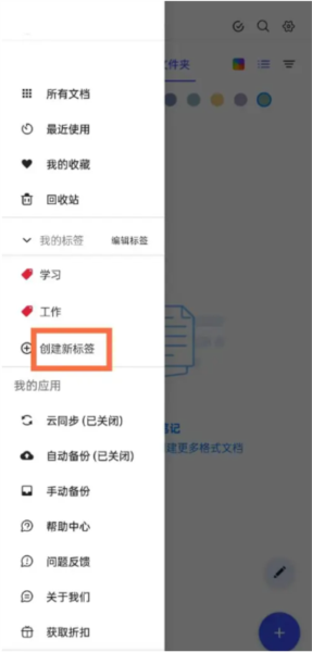 2、这时候会从左边滑出来一个侧边栏,往下看,找到【创建新标签】这个选项,点进去。