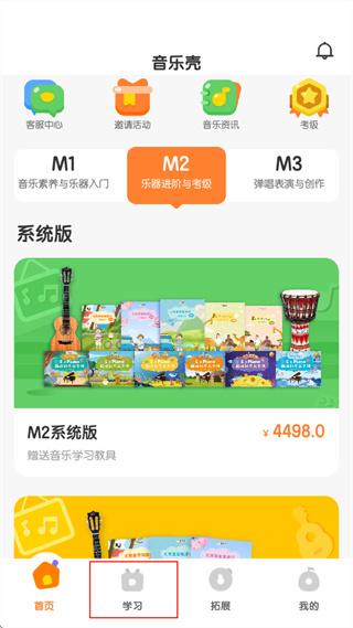 1、打开音乐壳app进入首页后点击“学习”板块就可以进入课程学习。