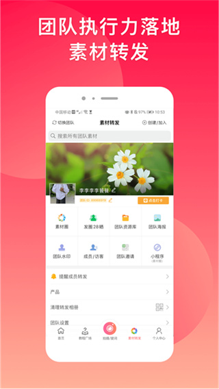 2、在“首页”底部点击“素材转发”再点击中间的“加入团队”,在输入对应的团队号后提交申请等待通过就可以加入团队,如果上级还没有团队也可以邀请对方先创建团队。